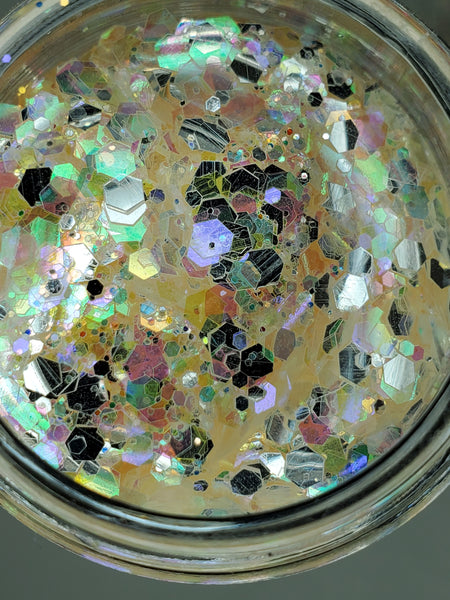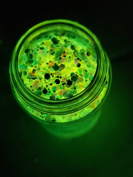 A crazy, amazing custom, GLOWING mix! A mix of chunky, high sparkle glitters, and ORANGE Glow powder! This mix is truly remarkable!
